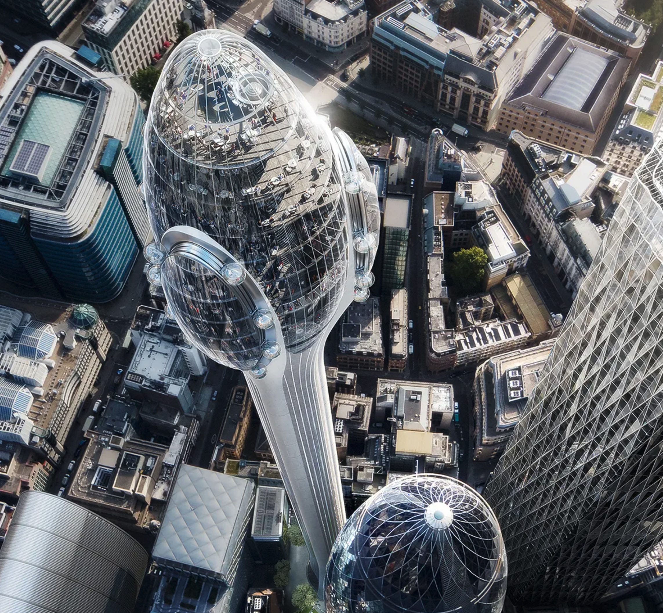 Unveiled in 2018, The Tulip was a proposed 305-metre observation tower next to 30 St Mary Axe (known as 'the Gherkin') in the City of London.