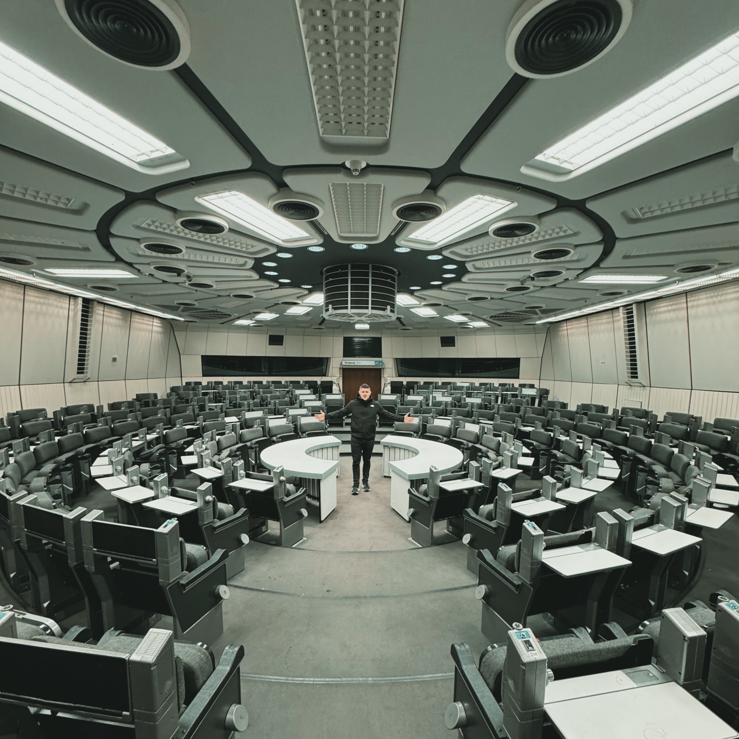 Above: The B1M's Fred Mills on set with exclusive access inside the heart of Berlin's abandoned ICC. Image: Fred Mills.