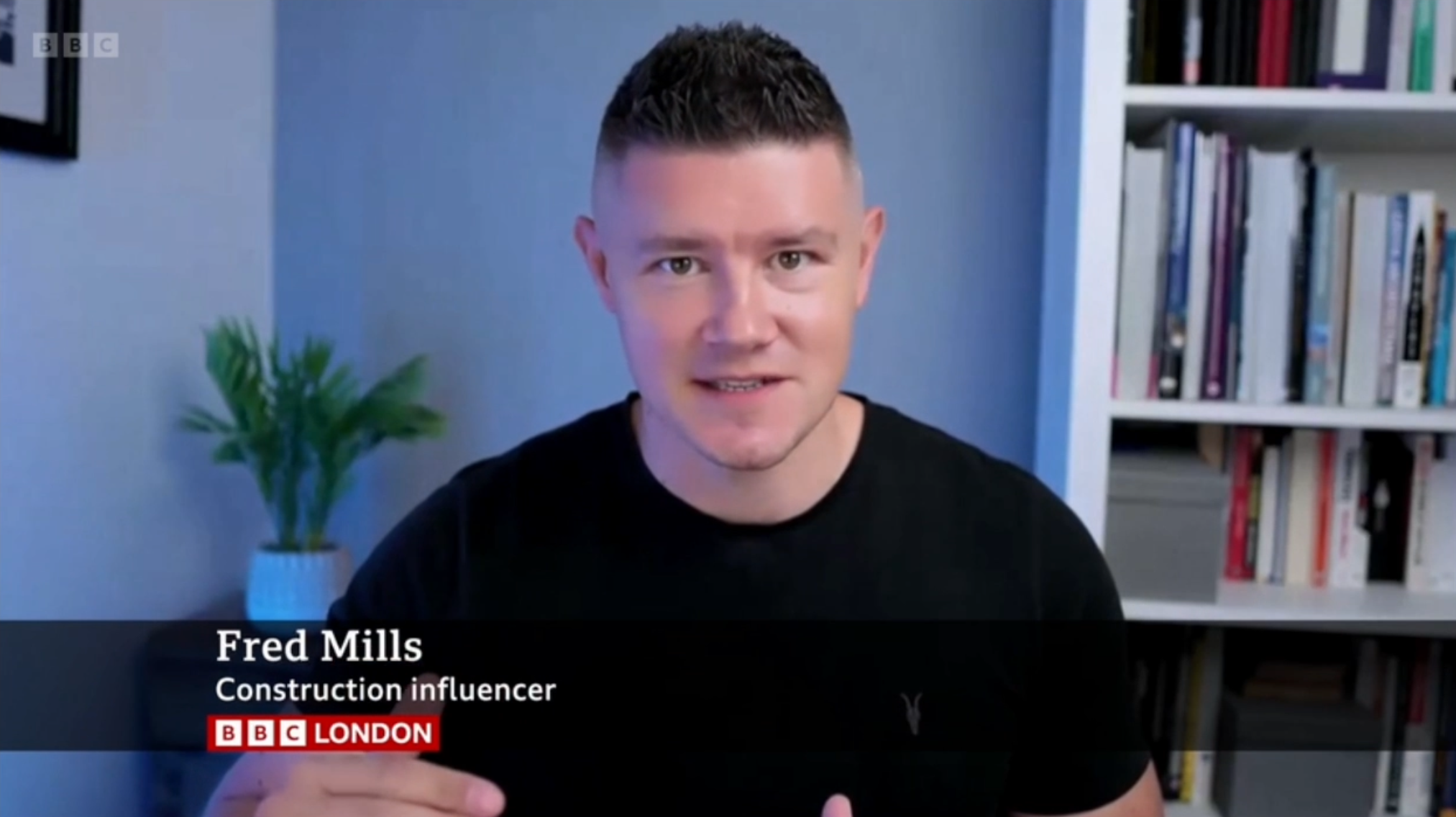 Above: The Tower of All Hallows Staining sitting above the Fifty Fenchurch construction site. Image: Fred Mills. Below: Fred Mills talking to BBC News about the project. Image: BBC News.
