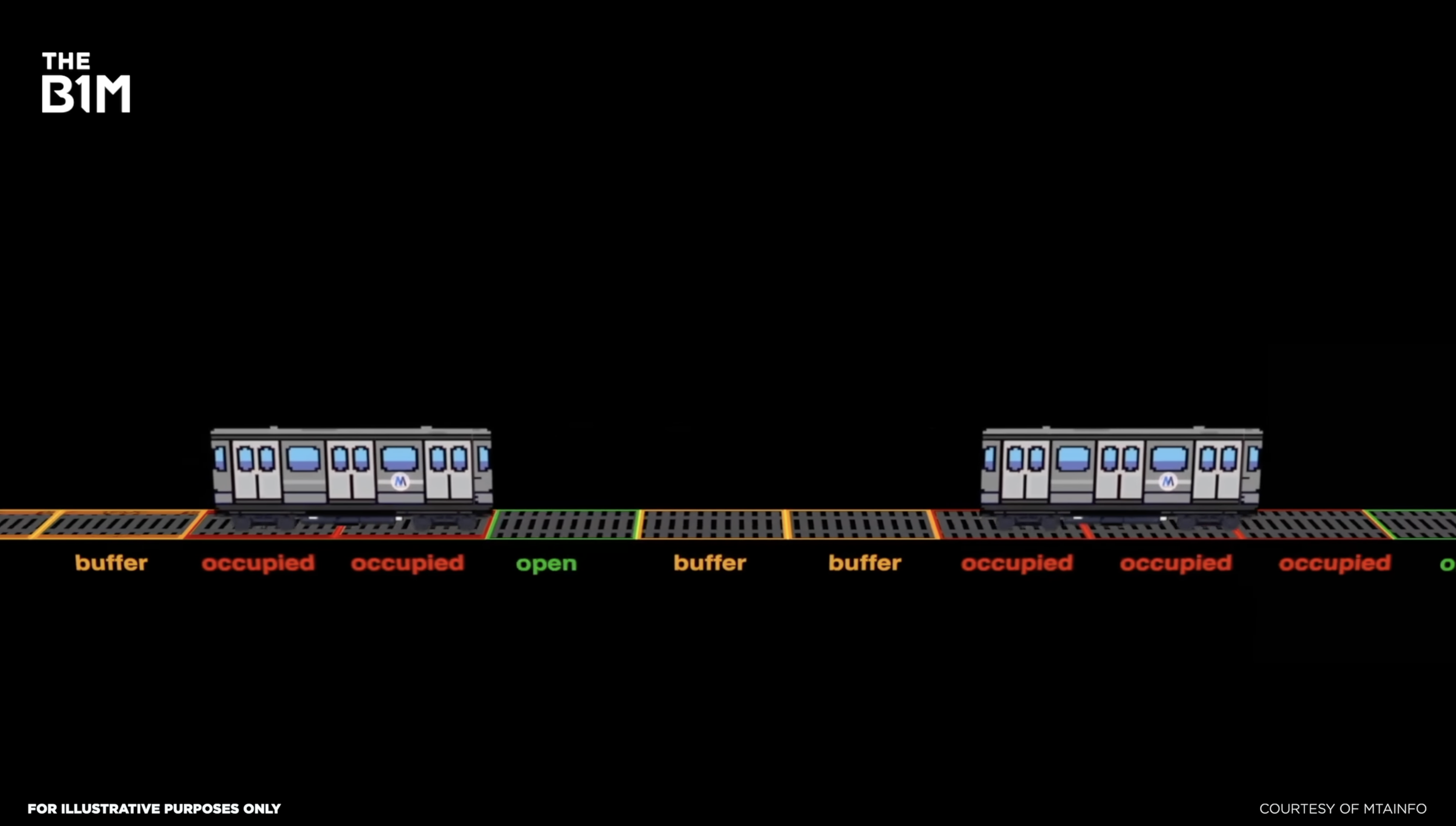With the exception of all but two lines, the subway runs on this: fixed block signalling. This is where the track is split up into blocks. When a train enters a block, the system flags it as occupied. It keeps traffic at a safe distance by creating a buffer zone behind it, which following trains can’t enter.