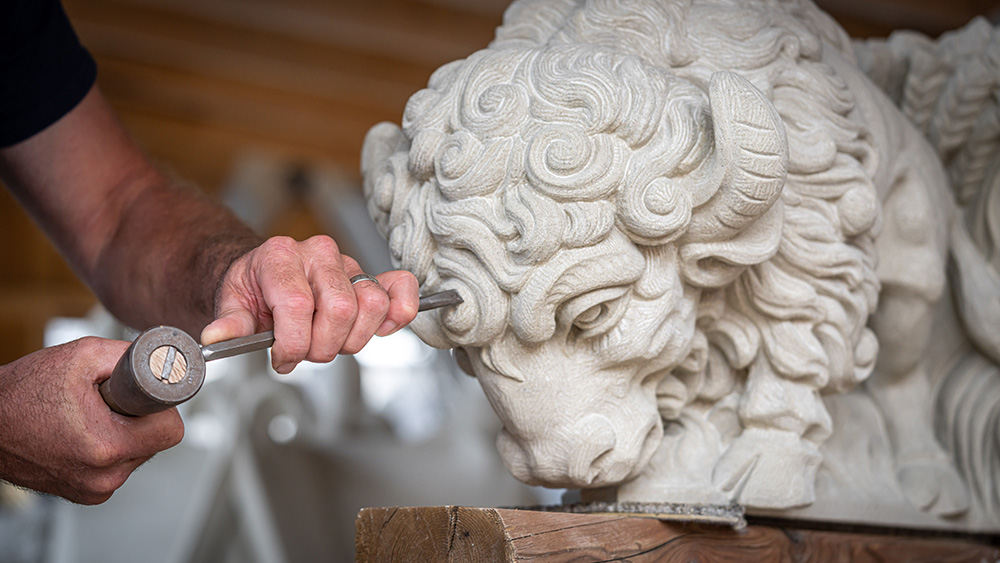 Above: A sculptor restores one of the main pieces of stonework that needed attention. Image courtesy of Public Services and Procurement Canada.