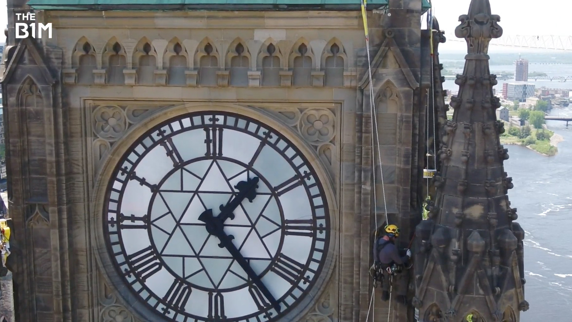 Above: A worker hovers next to one of the pinnacles. Image courtesy of Public Services and Procurement Canada.