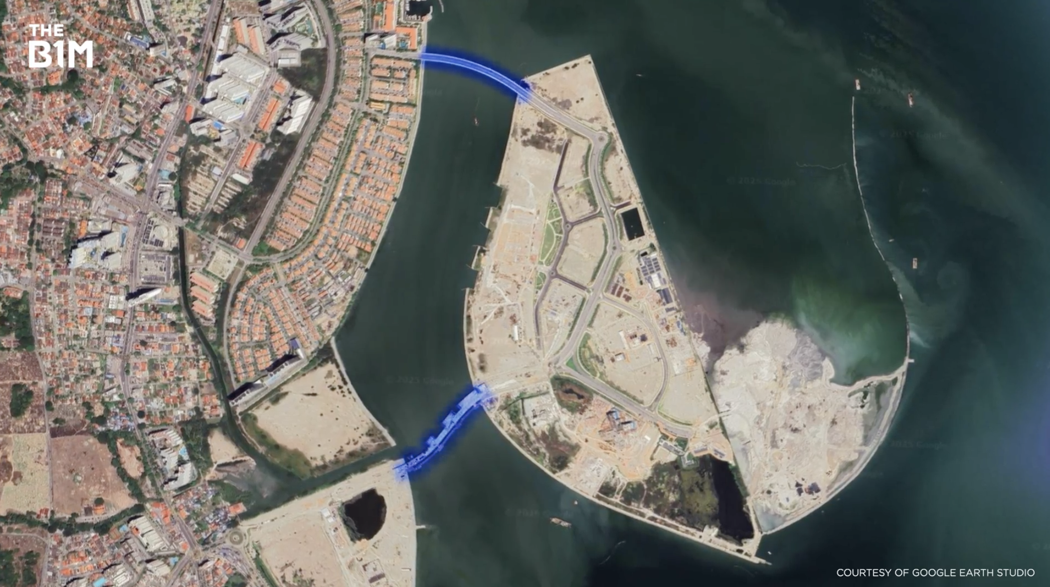 The new island is then connected to Penang Island via two road bridges: one to Straits Quay, an already reclaimed section of land and the other to Gurney Bay, an area currently being raised and developed.